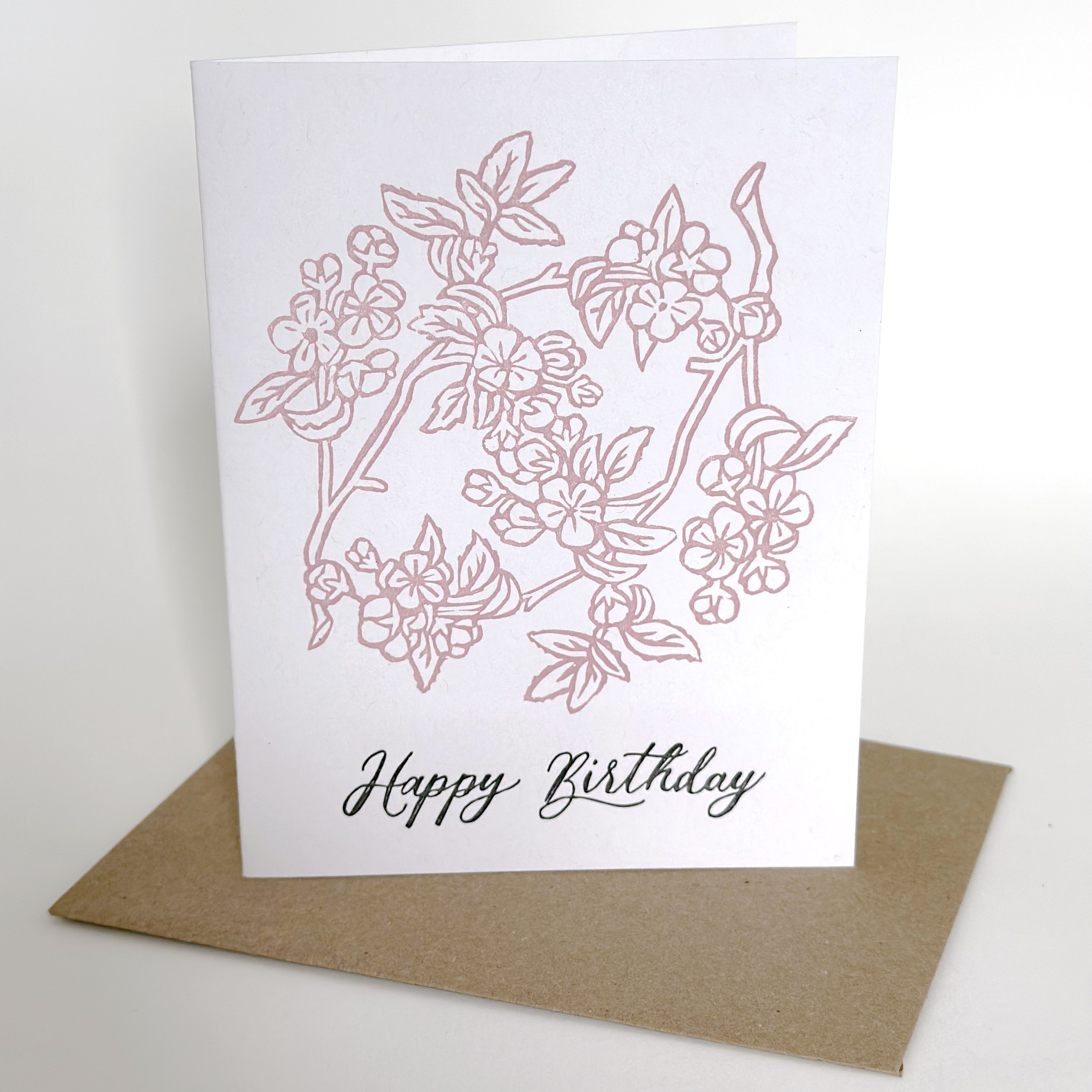 This two-color card features a hand-cut linoleum block print, and hand-lettered wording. Blank inside. Includes kraft envelope. A2 size.